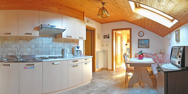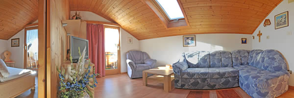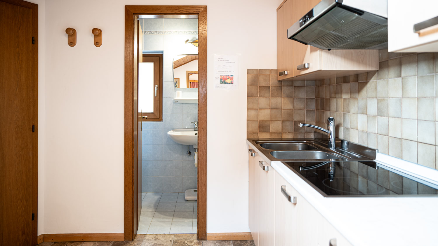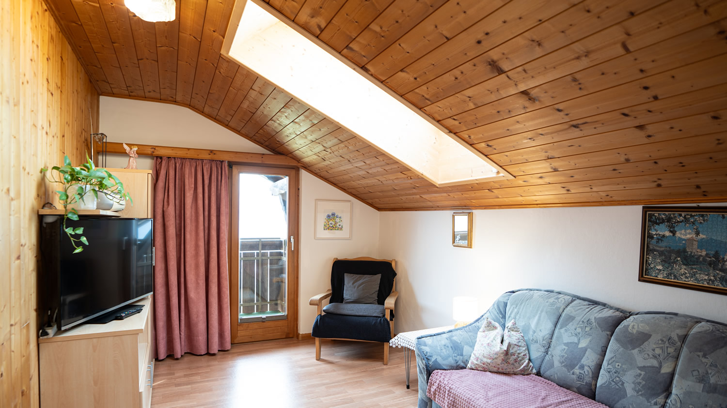 einer Küche, einem Wohnzimmer, Dusche, WC und einem großen Süd-Balkon (für 2-5 Personen).